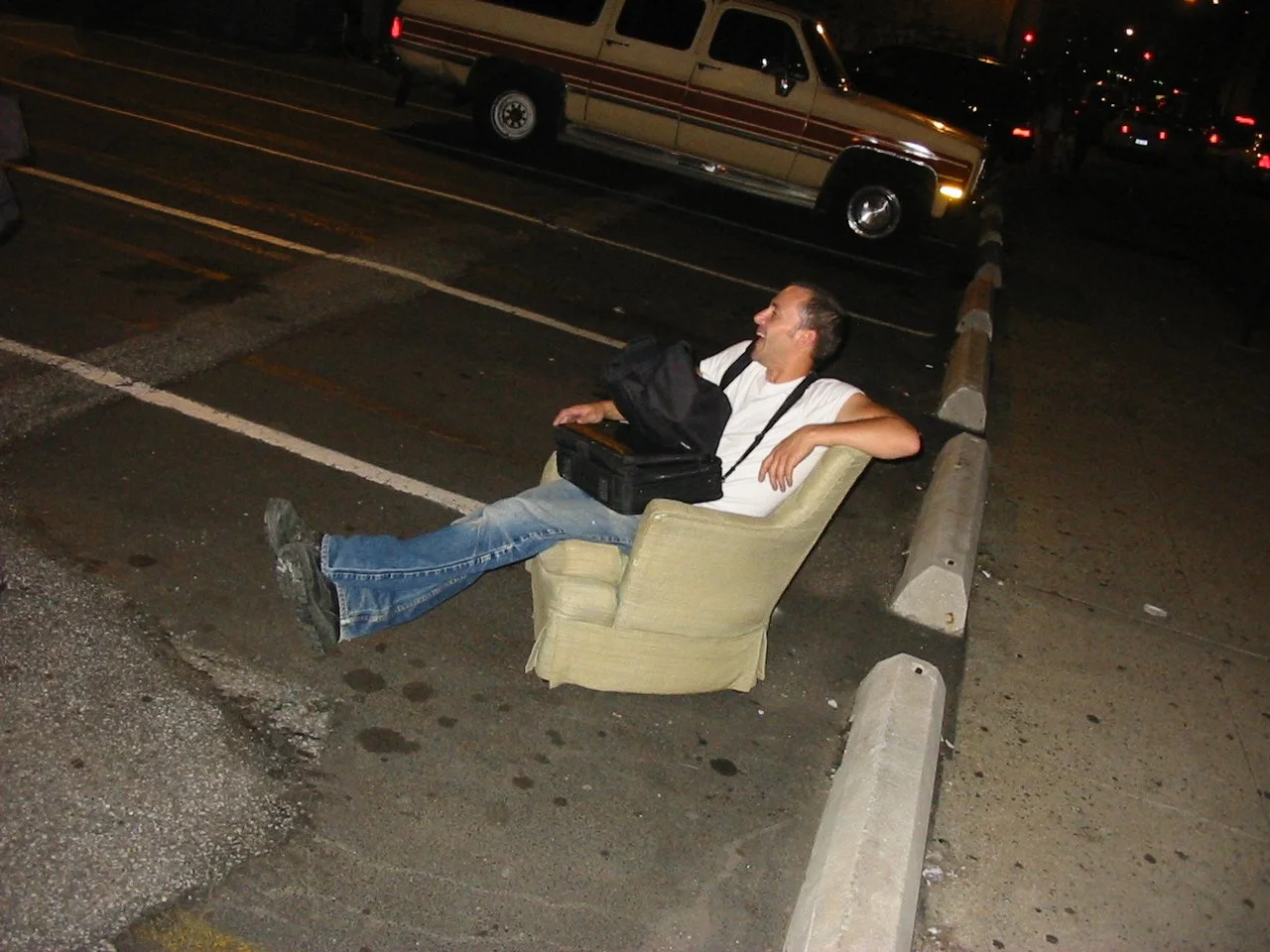 Todd went downstairs to sit by the door and let people into the building. And to warn them about the elevator that will chop your arm off if you're not quick enough. After a little while, I went down there too. Todd and I just hung out watching the people on the street. About halfway through the night, Brian came down to check on us and to get some air. "Yo, Bri, where's all the heat?" asked Todd.