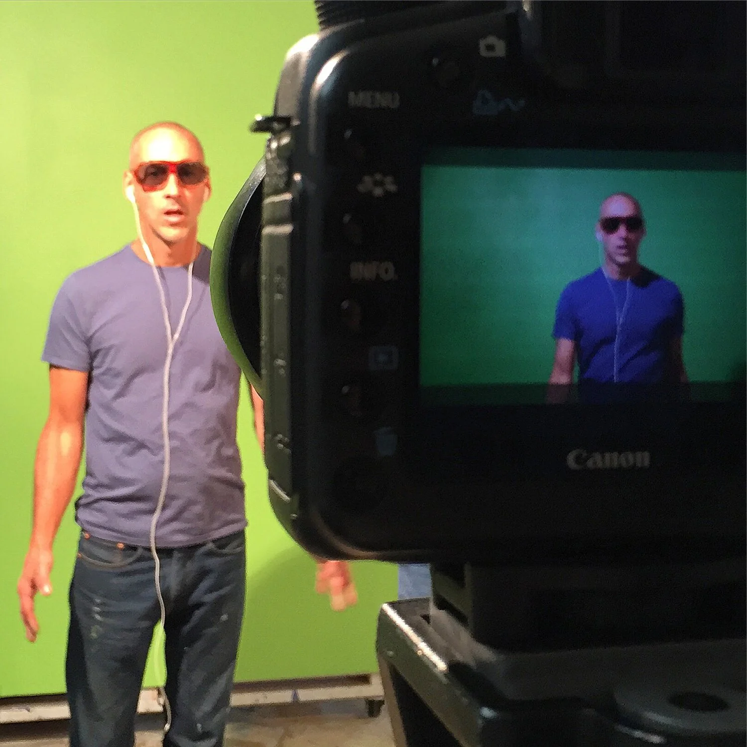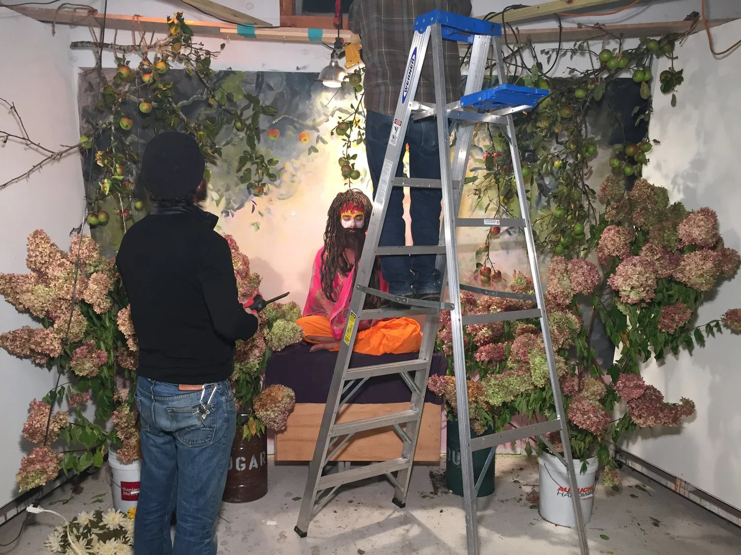 The apples wound up playing an essential role in the video. In one scene, Brian, a blue-tinted Hindu-inspired god-like being, releases two apples that float upwards and out of frame. We rigged them up with a fishing line. Brian drilled a hole through the core of each apple with a cordless drill. I laughed.
