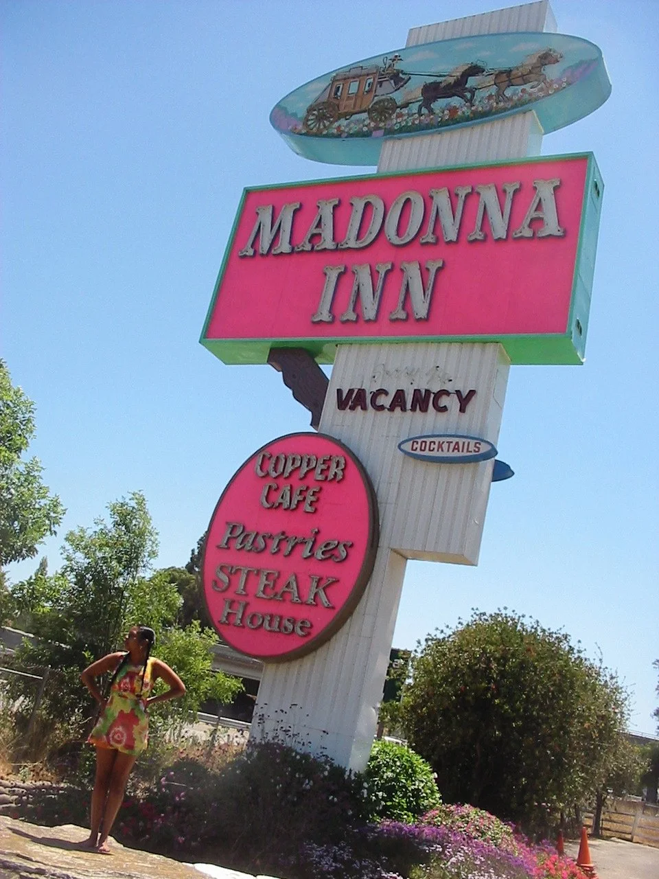 We climbed and descended through the sunshine and the fog, past the taco stands and the art galleries, listening to CD mixes, until evening, when a sliver of moon hung in the sweet, misty air. We pulled into the pink hotel nestled on the hillside. I'm tempted to call the Madonna Inn a time machine or an anachronism, but it isn't so much a trip back in time as it is a step outside of it. The fixtures and furnishings seemed to be pulled from a prop house, and the whole place felt like a period movie set. Though which period is hard to say. A movie made in the 70's about the 1800s written by a Harlequin Romance novelist and directed by Peter Fonda.