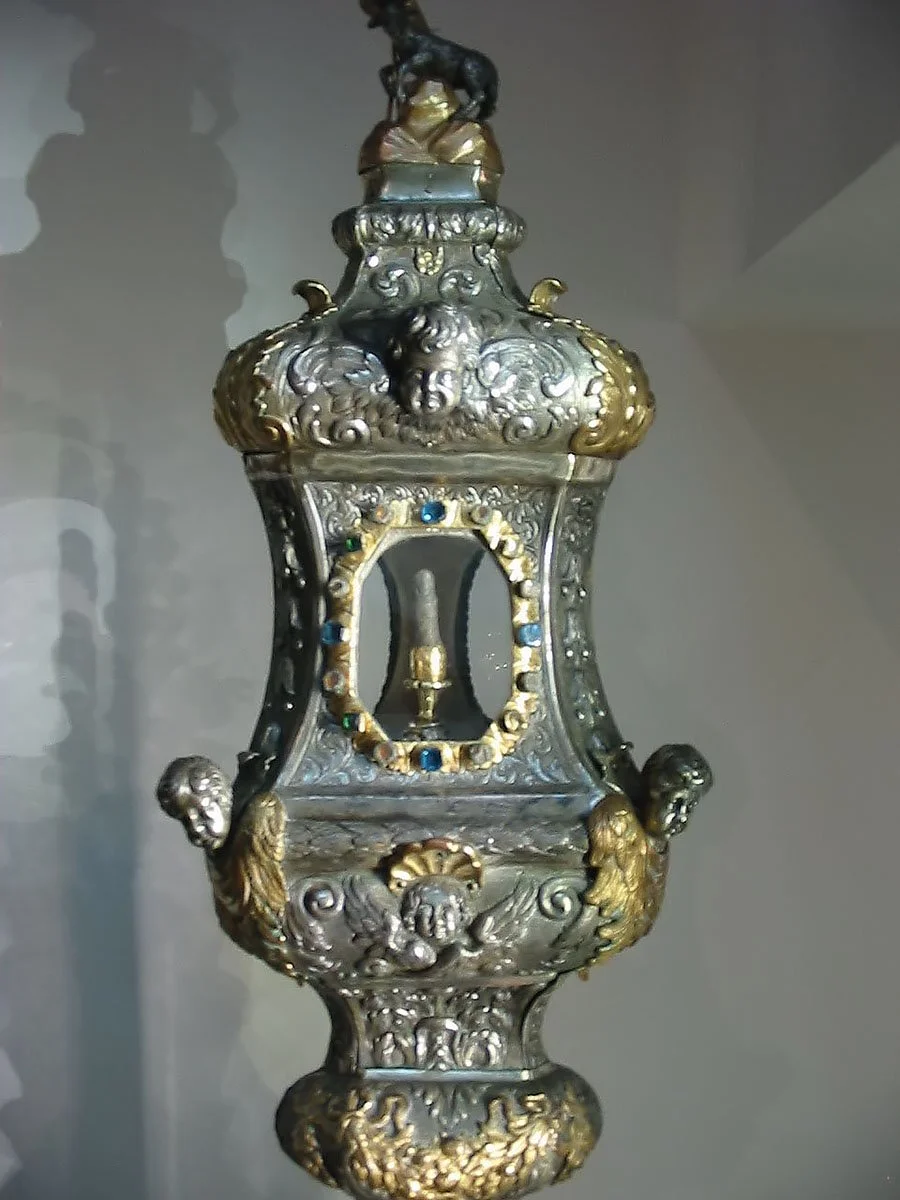 Can you tell what this picture is? It's a fucking finger! Some old saint’s finger in a fancy display case. Having been raised Catholic, I know how nuts they can be, but c'mon! A fucking shriveled old finger? I saw all sorts of relics—jaw bones, thigh bones, little bone chips, half skulls—all set in fancy glass and silver cases. But I think the finger wins the prize.