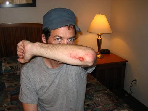 However, shitting in a pit toilet turned out ot be a luxury as well. Since we weren't able to camp at Arches National Park, I dug out a map that my friend Brad had sent me before we left, and drove several miles to a remote campsite he'd recommended. No crowds, no ranger station, and no toilets. The protocol for such a place is to pack out whatever you pack in, including your shit. I won't go into the details of how that's accomplished, but Deborah was a good sport and did what she had to do. Unlike in more temperate climates, where, if you shit in the woods, it will eventually decompose and wash into the earth, in the desert, shit simply desiccates and stays around forever. Nothing ruins the sense of communing with nature quite like random piles of dried-up human shit. Of course, even without the petrified shit, we'd be reminded of humanity anyway, by the sound of gunshots echoing through the canyons, but that's another story.