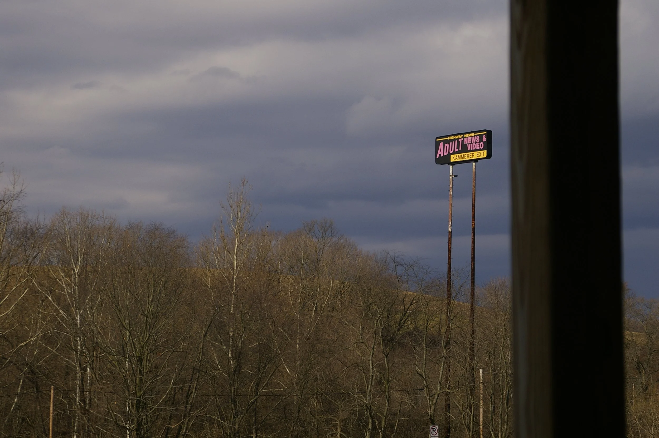 The Carlton is located right on the Interstate, across from a tall illuminated sign for an adult bookstore. "Adult Books and News," it says. (Adult News?) If the woman who answered the phone when Deborah called to confirm our reservation had simply said, "It's exit 32 off I-70, across from the adult bookstore," we would've found it easy enough. Instead, she told Deborah it was off Route 40 — an unlit and barely paved state road that had us winding our way, out of the way, for an hour in the rain. The driver of a Li'l Red Express hotrod pickup truck, who undoubtedly knew the road inside and out, bore down impatiently and harassed us with his high beams. When I finally found a place to pull over to let him pass, he floored it, kicking up gravel that plinked against the thin sheet metal of our cheap rental car as he roared past.