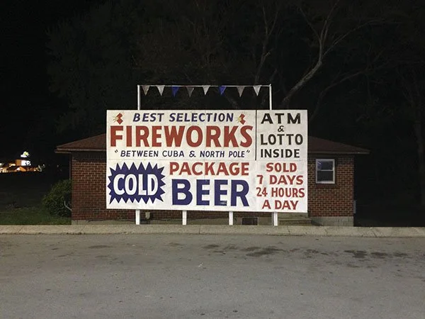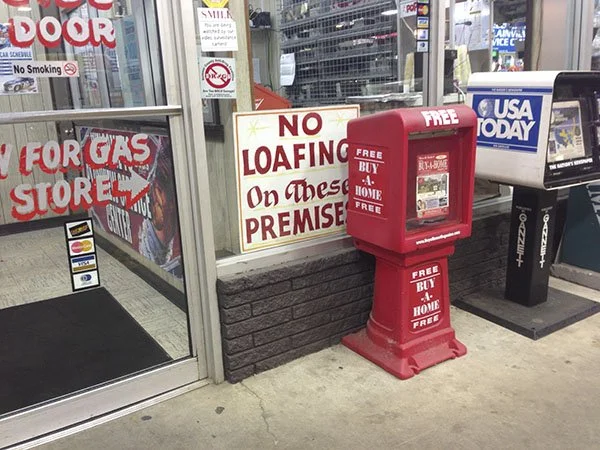 The car conked out in Barstow, California. It was my turn to drive, but when I turned the key, nothing happened. When the tried and true method of banging on the starter with a hammer didn't fix it, we called for a tow and spent the morning killing time on Barstow's main drag. In an antique store, Wade bought a street sign riddled with bullet holes and a few Army surplus boxes he planned to use for storing tools. Bulky items, but still "plenty of room on the trailer."