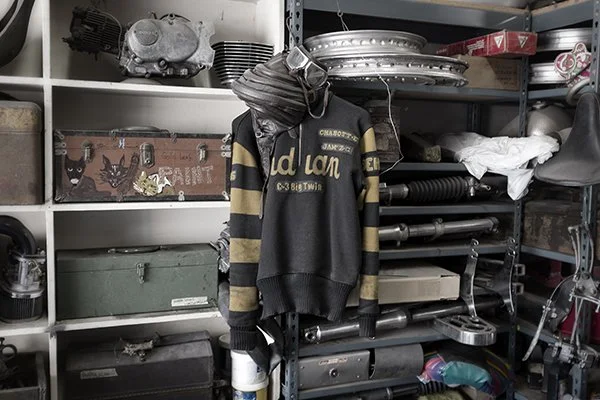 Chabott Engineering is a wonderland of massive industrial machine shop tools, storage bins, vintage engines, gas tanks, wheels and pipes, cut steel, bent aluminum, photographs, posters, postcards, and, of course, beautiful custom-made motorcycles such as the 1957 Triumph-powered steampunk rocket ship known as "The Needle."