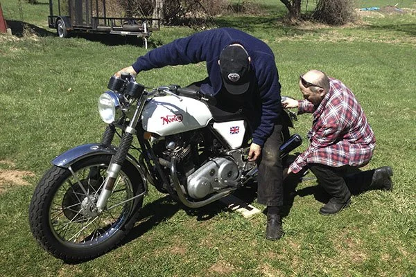 Eventually, Tom got into the spirit of things -- got bored of standing around, anyway, and wanted to speed things along. He grabbed a wrench and joined us, even allowing Deiter to inspect his vintage Norton, knowing full well it probably wouldn't pass muster.