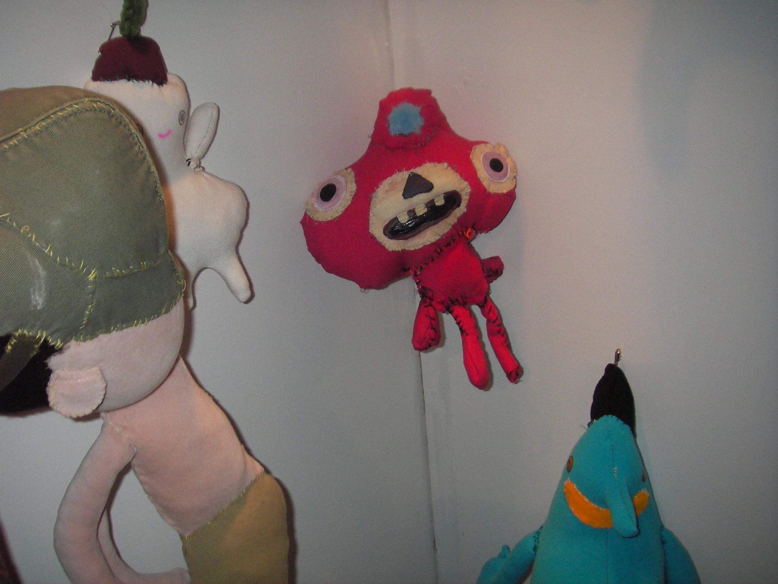 While the bank continued its set, Deborah and I poked around to see what else we could find. At the entrance to the Live With Animals gallery was a makeshift bar selling fundraising drinks for reasonable prices to a long line of sweaty beards and stringy hair. We crossed the line and squeezed into the gallery. Bright, cartoonish paintings and sculptures littered the walls and floor. A door in the back led to a maze-like installation that looked like the aftermath of an explosion in a kindergarten's art department. Dayglo spray paint, tempera paint, magic marker, felt, construction paper, and cardboard. Everything hanging cockeyed. Random words and phrases were written in a variety of colors all over the place. Scrawled in magic marker on a piece of plain white paper cut in the shape of a cloud and suspended from a wooden one painted white and hanging from the ceiling, were the words: Watch your head.