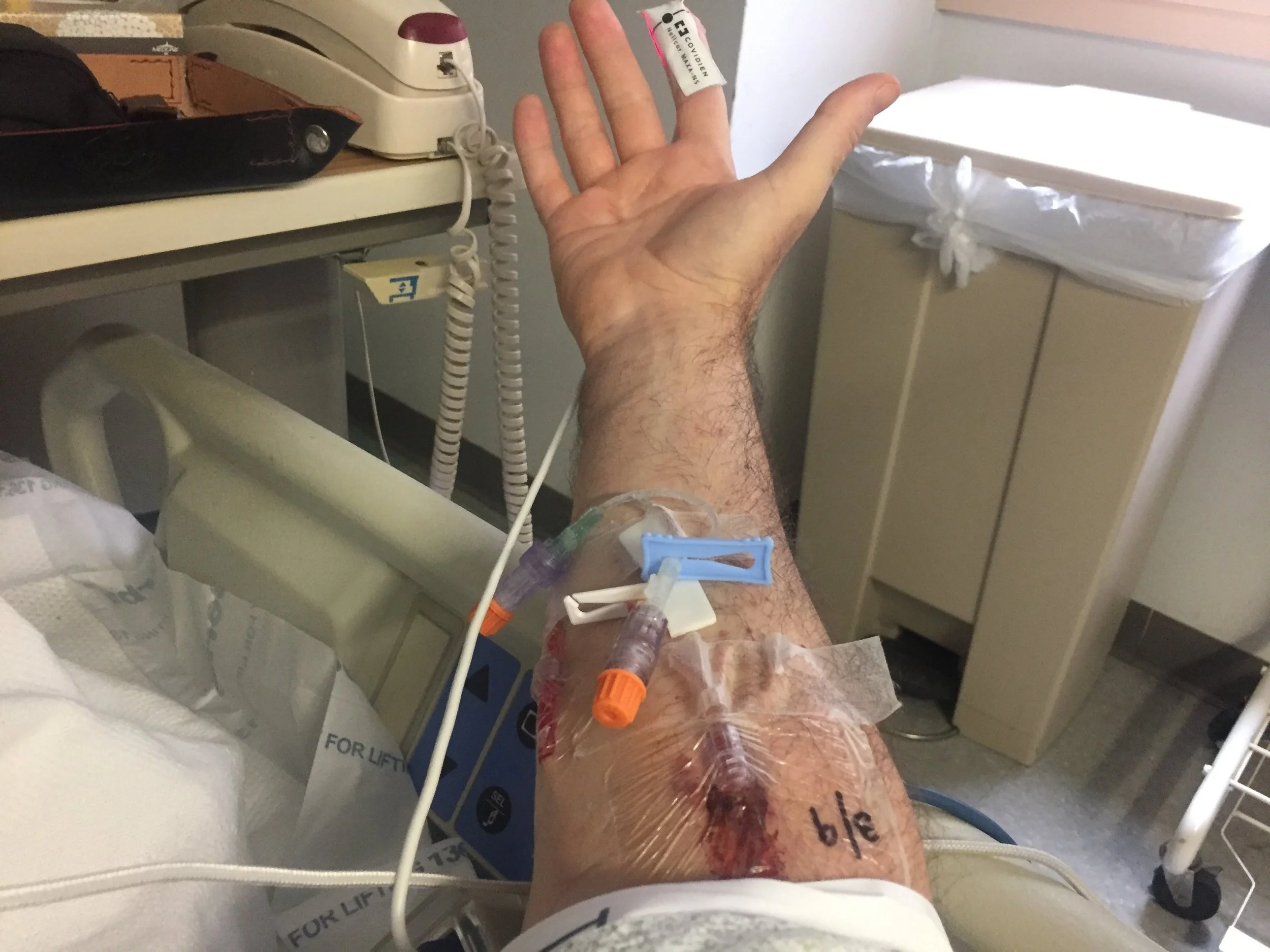 But I wasn’t fully — I was still half-submerged in a soupy blur of delirium. A red beacon had materialized only a few minutes earlier to lead me out of my fog like the taillight of a distant car. As my eyes and mind began to focus, I realized the red light was no larger than a sesame seed. It was attached to a wire and taped to my fingertip. I waved my hand slowly and followed the light with my eyes. The movement tugged at the tube of an IV inserted into my forearm. Another IV dangled from my other hand, apparently attached to nothing. Several wired electrodes were stuck to my skin, too, in what seemed like random places on my chest and stomach. I was naked under a hospital gown and had no idea how I got that way. The paper-thin bedsheets smelled of bleach, washed to the point of being nearly transparent. As I pulled them over me, the tape holding the light to my finger slid off, causing a monitor beside me to chirp. An array of brightly colored graphs and numbers glowed from the monitor like a finance show on cable TV. And just like the stock market, I had no idea what it all meant. Whether I should buy, hold, or sell.